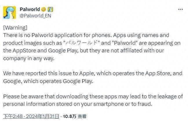 1月31日,《幻兽帕鲁》官方社交媒体发文提醒玩家:《幻兽帕鲁》没有手游版应用,因为近日有使用《幻兽帕鲁》素材并顶着“Palworld”之名的应用出现在iOS商店和谷歌商店中,《幻兽帕鲁》官方表示这些APP与他们没有关系,他们已经向苹果和谷歌报告了此问题。