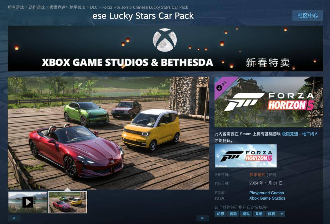 《极限竞速:地平线5》最新的“中国福星车包”现已上线Steam/Xbox,国区售价均为¥19,目前多半差评(和DLC质量没关系)。