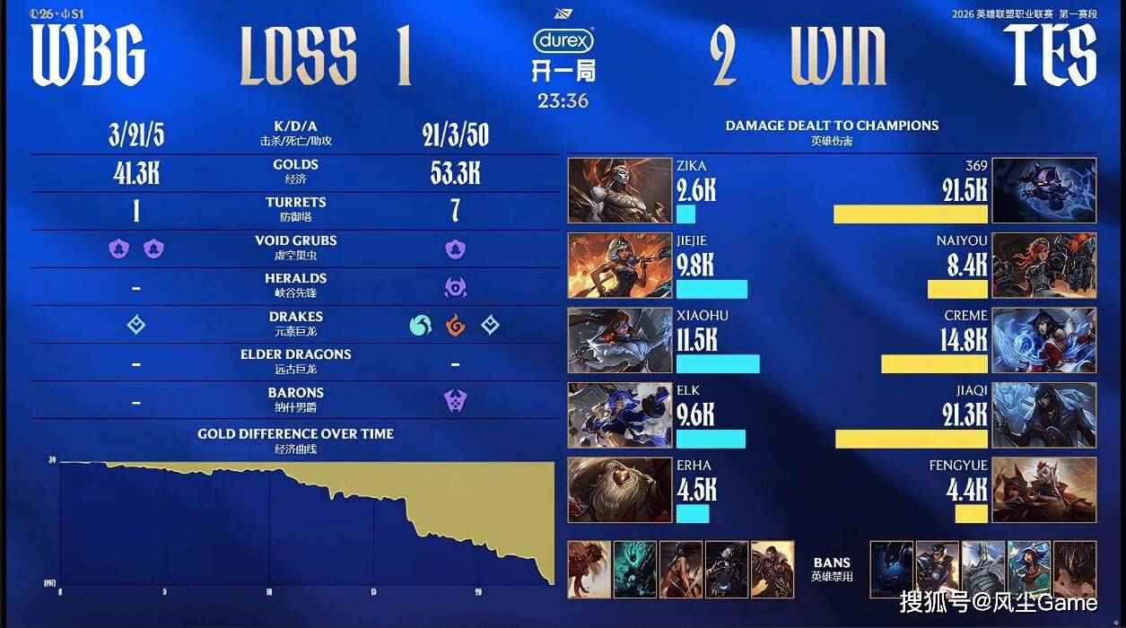 同一天的另一场比赛,是TES大战WBG,两支全华班的对决,比赛结果也是出人意料,滔搏哥开赛二连败,连续被京东、BLG零封,赛前大家都觉得打不过WBG,结果滔搏不仅赢了,决胜局还打出23分钟的速通记录,新赛季开赛到现在,可没有几场比赛,是在25分钟之内,解决战斗的。