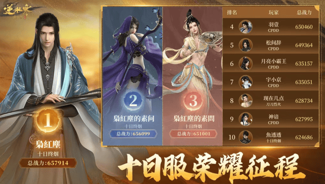 除了浮夸,还有羽壹、枭红尘等圈内大佬也纷纷入驻,一时间十日服的排行榜变成了“钞能力比拼大赛”——羽壹6天就氪金66万,枭红尘更是8天怒砸350万,三个号直接霸榜前三,浮夸看到了吓得连夜跑路。