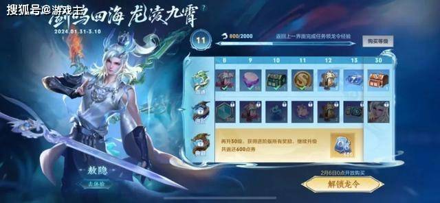 新春龙令的持续时间是1月31日至3月10日,进阶龙令的购买时间是2月6日至3月10日,典藏龙令的购买时间是2月6日至2月16日。