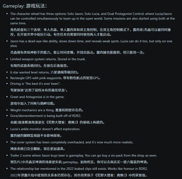 其他相关爆料指出,《GTA 6》将引入类似《荒野大镖客:救赎 2》荣誉值机制的人际关系系统,玩家甚至可以同时操控两位主角进行游戏。