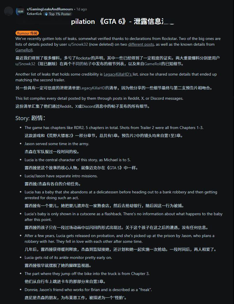 该爆料源自一位据称与《GTA 6》开发者有直接接触的知情人士,其内容被收录在 Reddit 论坛的一篇汇总帖中,该帖子还整合了其他可靠内部人士的爆料与可信度较高的信息。