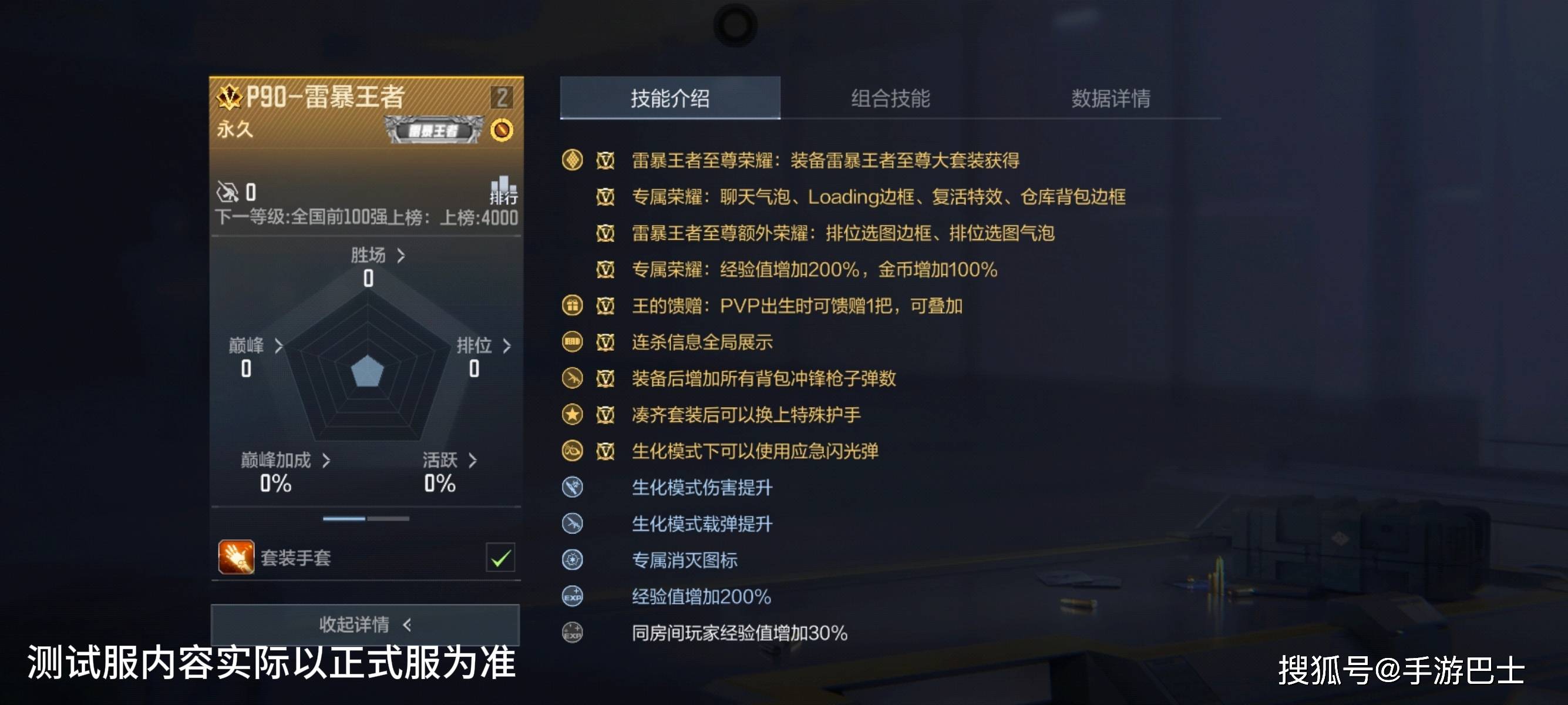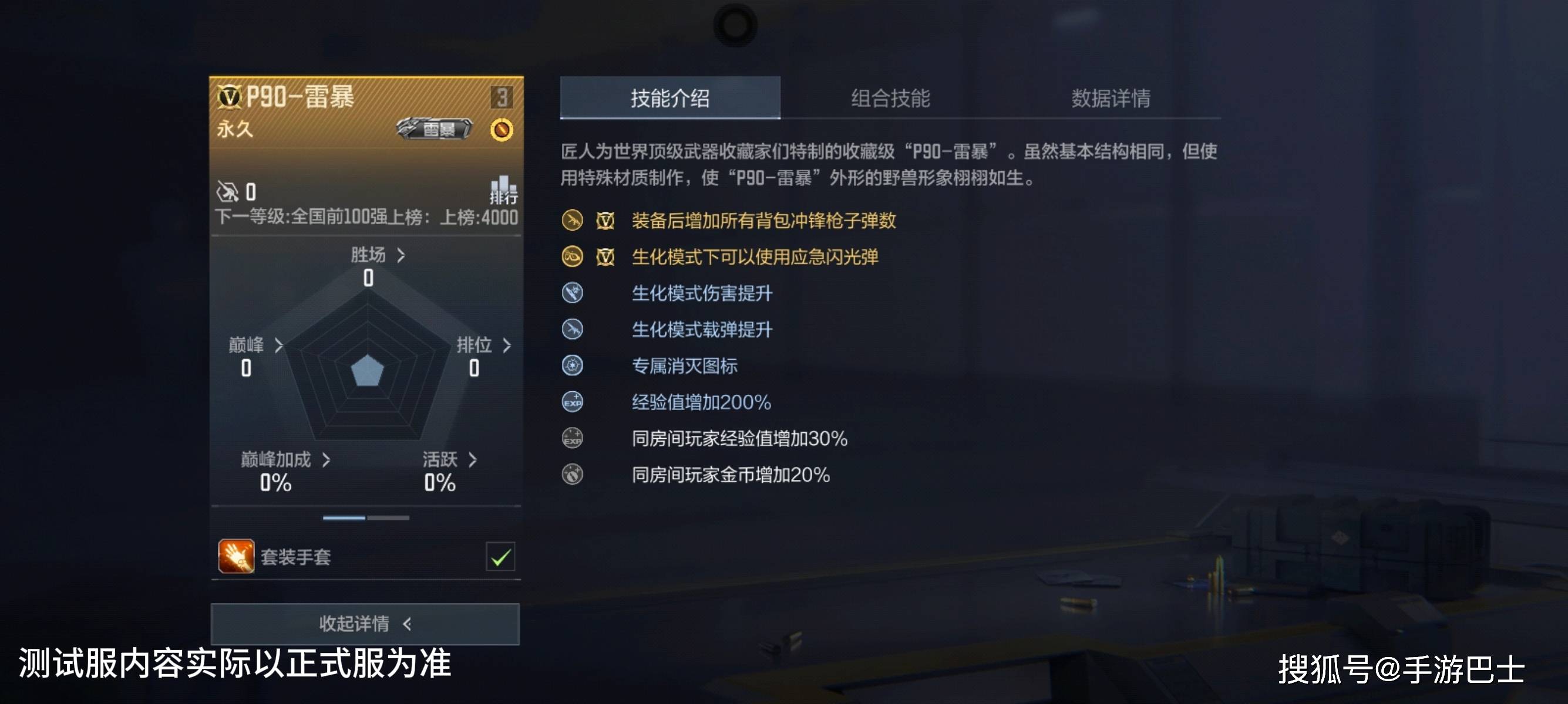 P90-雷暴王者的技能兼顾PVP、生化模式。在PVP对战中,它拥有王者武器基本的王的馈赠技能,出生时可向队友馈赠该武器且效果能叠加。另外装备后增加所有背包冲锋枪子弹,提升了冲锋枪续航,此外,凑齐套装后还可以装备上特殊护手。