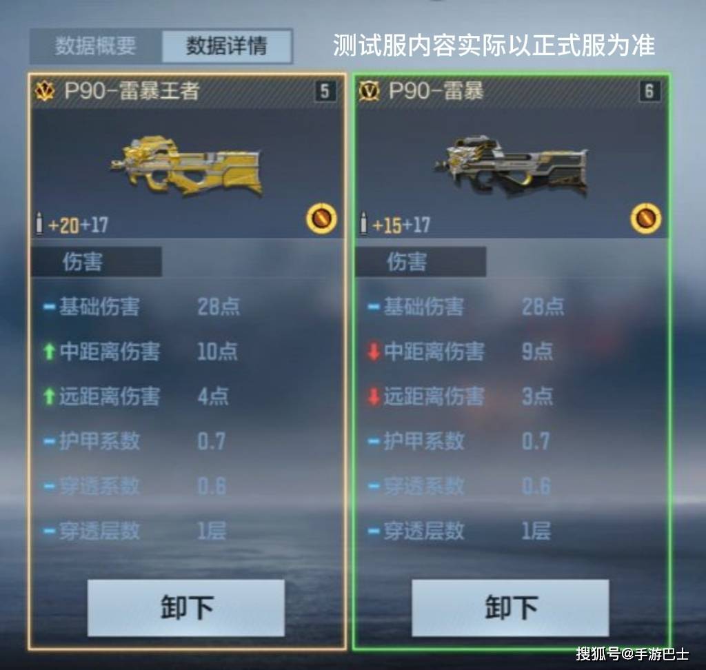 我们将P90-雷暴王者与P90-雷暴的基础性能进行对比。在伤害层面,二者基础伤害同为28点,但P90-雷暴王者的中距离伤害(10点)、远距离伤害(4点)分别比P90-雷暴高出1点。距修的优化可以使得P90-雷暴王者在中远距离对枪时打出更高伤害,压制力更强。