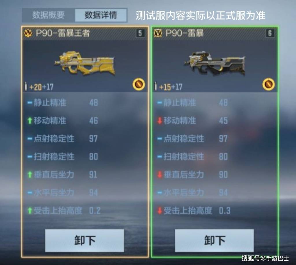在操作方面,P90-雷暴王者的移动精准为46、垂直后坐力为91略高于P90-雷暴王者的移动精准45以及垂直后坐力90,在竞技模式中正面移动对枪时,P90-雷暴王者更具优势。同时在弹道稳定性方面,P90-雷暴王者的受击上抬参数为 0.2,低于P90-雷暴的 0.3,这意味着实战中开火时的枪口稳定性更强,受击状态下的弹道偏移更易控制。