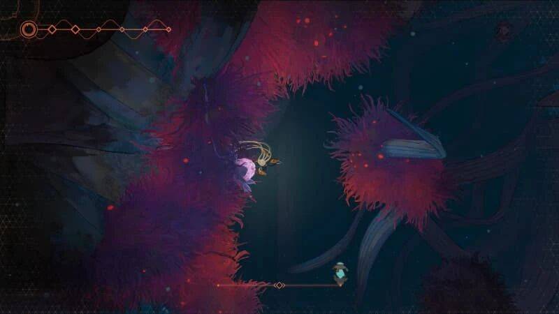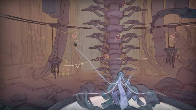 既然是 2D 类银河城游戏,《秘奥:秘宇奥忆》自然也设置了大大小小的平台跳跃环节。首先是抓钩发丝的作用更加突出,很多平台一眼就知道没办法直接跳过去,细看就能发现抓钩点。