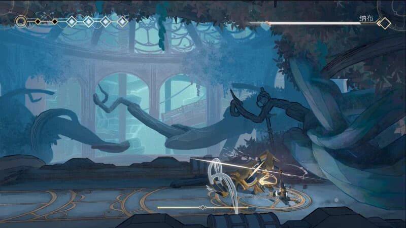 再举个例子:继续向左上进发会遇到“人马”BOSS 息声守护者,这场战斗明显就要活用环境和 CD。虽说本身并不高速移动,但会持续改变战场结构,地上的追踪尖刺需要走位,而且每打掉三分之一血后,便会释放腐水浸泡地面,必须靠悬浮技能和打击果实保持浮空。这类二阶段制造危险区域或封锁路线的 BOSS 非常多,需要玩家时刻注意能量条 CD,或利用抓钩调整站位、攻击弱点,或借助敌人身上的钩锁绿点完成位移,都属于是必学操作。