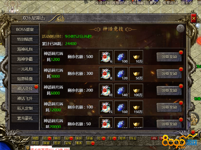 神话竞技活动: 这个活动的核心是消耗圣器碎片,通过达到一定的数量,可以领取额外的神话碎片随机福袋。这为玩家提供了一个快速获取圣器碎片的机会。