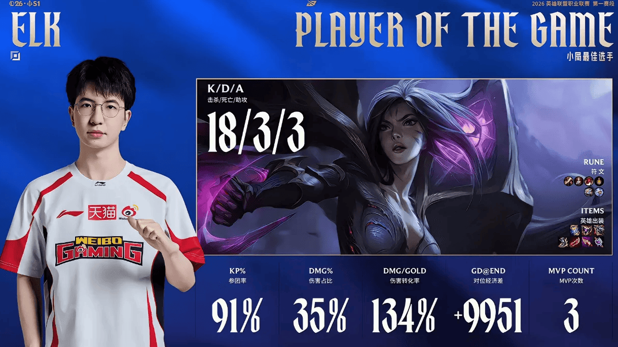 但到了第二局,画风突变,WBG掌控下路的主动权,彻底变成ELK卡莎个人秀。说实话,见过很肥的卡莎,但没见过这么肥的,一个人装备比对面双C装备加起来还多,伤害更是看不懂,最终ELK以18/3/3的豪华数据直接带躺。