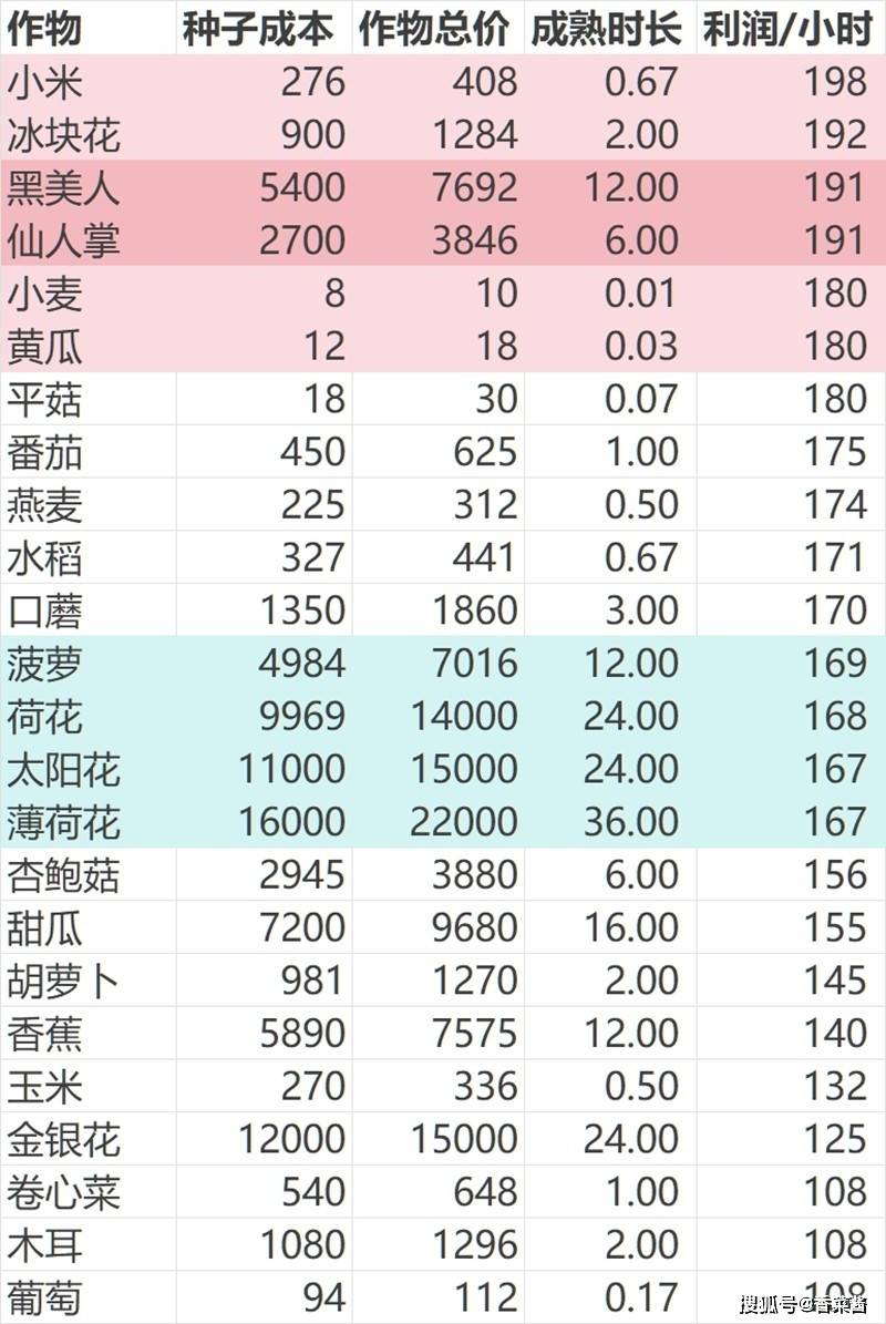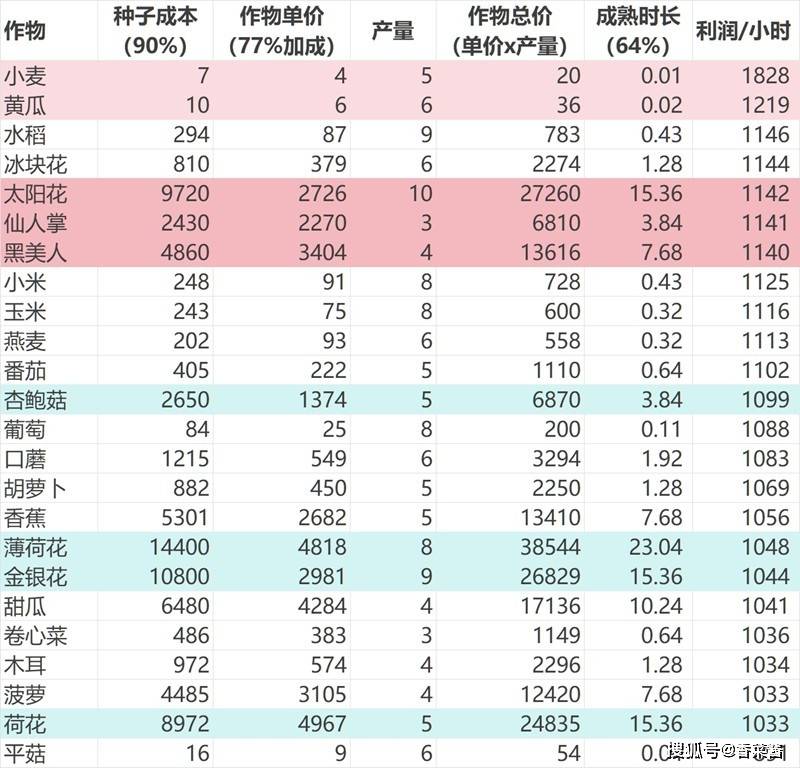 经验:包括最新口蘑在内的所有菌菇类都比较高,为79-80/小时这档;黄瓜90小麦180,但考虑到过肝而且订单用处不大,我个人不考虑。其余所有均为66/小时这档(部分多1经验几乎可忽略)。