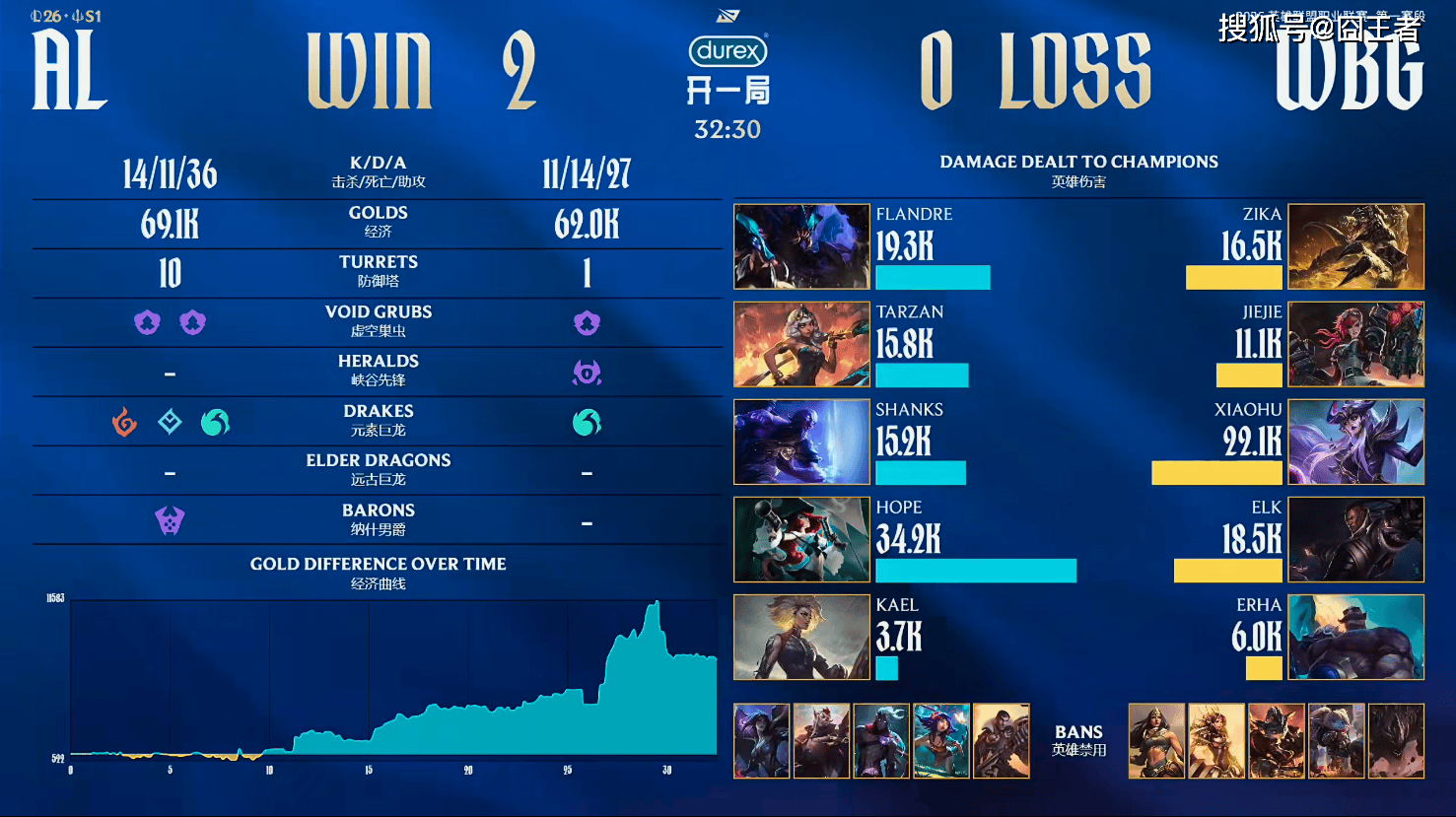 结果第二局比赛,AL并非吹灰之力,就取得了胜利,送WBG两连败。比赛前期,AL对线运营不断压制打出4000多的经济领先;比赛第25分钟左右,WBG抓掉Flandre雷克塞后果断开打大龙;比赛第26分钟左右,Tarzan奇亚娜怒抢大龙,AL打出1换5团灭WBG;比赛第29分钟左右,WBG打出2换5打退AL推家;最终比赛第32分30秒,AL一波偷家结束比赛。