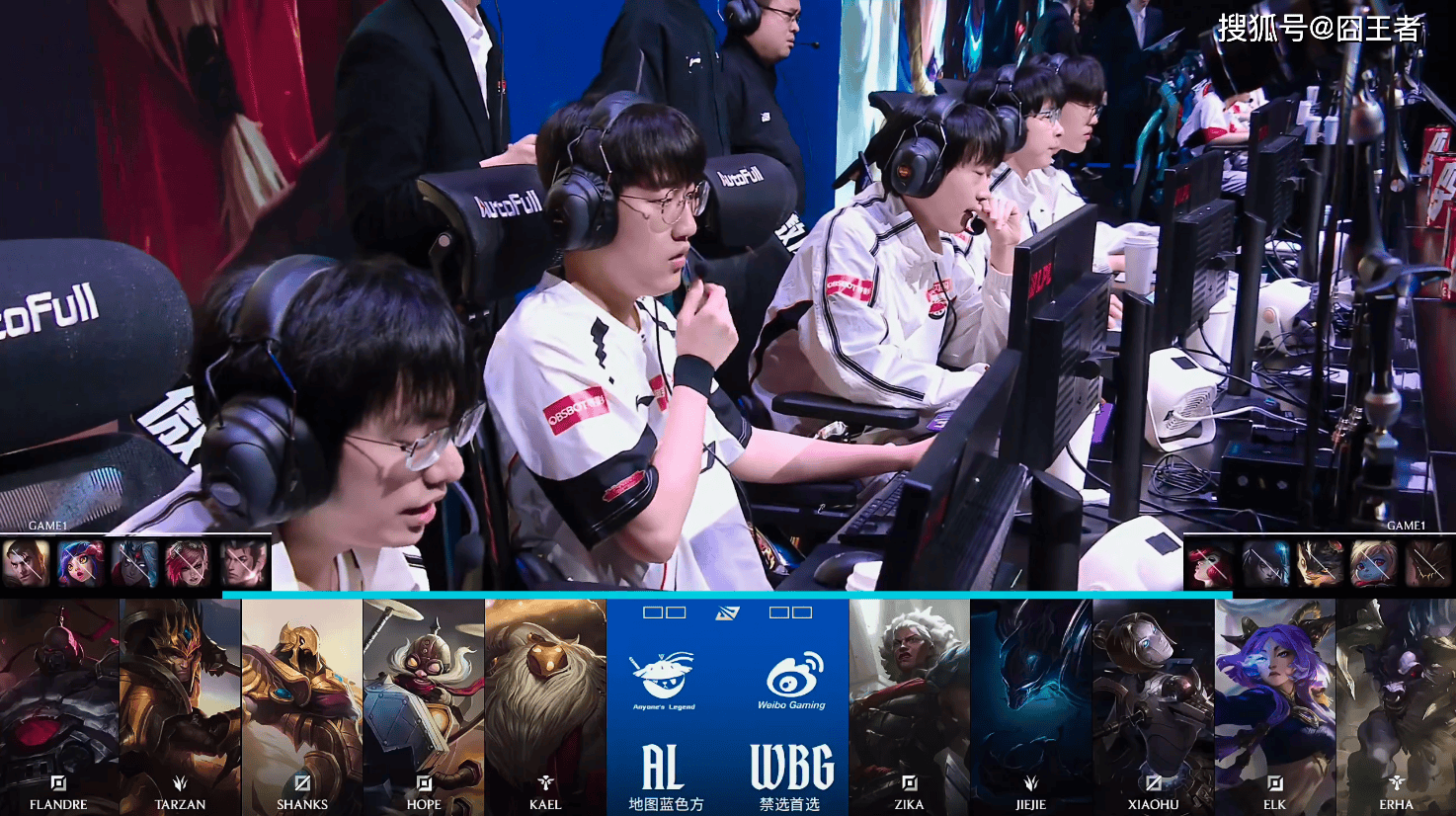 第一局比赛,A L蓝色方,禁用:杰斯、妮蔻、韦鲁斯、蔚、赵信,选用:Flandre塞恩、Tarzan皇子、Shanks沙皇、Hope飞机、Kael巴德;W BG红色方,禁用:石头人、波比、兰博、厄斐琉斯、女枪,选用:Zika安蓓萨、Jiejie梦魇、Xiaohu发条、Elk芸阿娜、Erha牛头