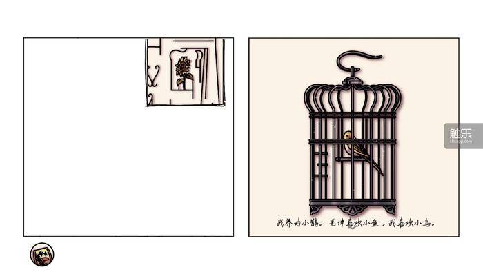 有时,左边是朵花,右边对应的是老人家里的时钟。现实房间里插在衣服兜里的纸、相框、鸟笼里的鹦鹉,在左边的视线框中都幻化成了迷宫中的花和各种物品。