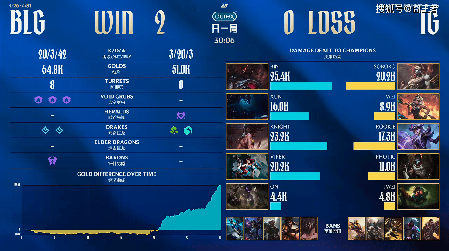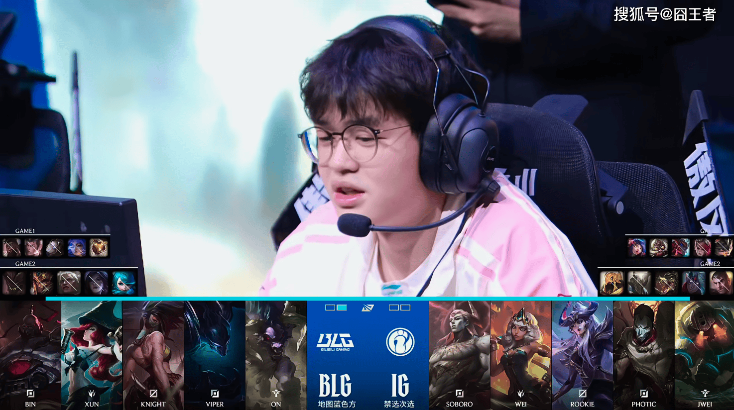第一局比赛,BLG蓝色方,禁用:石头人、皇子、韦鲁斯、卡莎、辛德拉,选用:Bin奎桑提、Xun赵信、Knight发条、Viper芸阿娜、ON巴德;IG红色方,禁用:杰斯、波比、沙皇、梦魇、潘森,选用:Soboro兰博、Wei蔚、Rookie永恩、Photic飞机、Jwei妮蔻