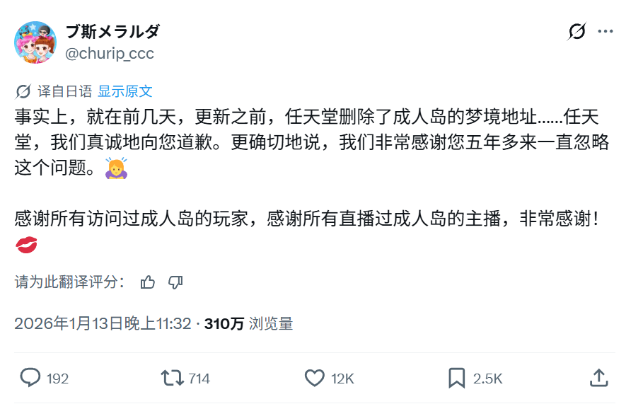早在2020年《动森》发售初期,“成人岛”的雏形就已经出现,之后五年里Churip的“成人展览”越做越大,之后任天堂推出梦境功能后,参观岛屿的门槛也降低不少,“成人岛”的知名度跟着水涨船高,考虑到任天堂对成人内容的敏感性,“成人岛”直到现在才被处理也实属不易。