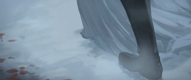 第一个决定性的场景就是角色在覆雪的梅园中紧张对峙。这个画面一下子就把调子定住了。雪景冷寂,梅树孤傲,对决的二人衣袂飘飘。红衣道士鹭鸶剪面向镜头,眼神泠冽地喊出「看剑!」
