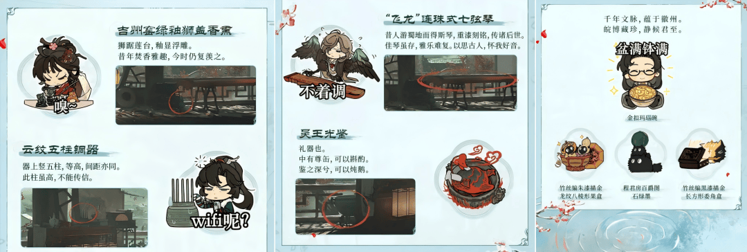 甚至,连主界面UI和布景,也推出了徽派风皮肤;游戏与安徽文旅、安徽博物院的联动,更让布景藏了不少古董文物的身影,版本收藏品同样是馆藏文物;