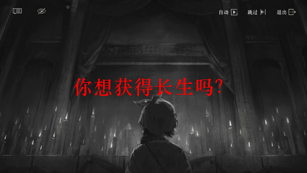 这个追问在剧情中途,以一种猝不及防的方式砸向玩家:屏幕骤然褪为黑白,唯有一行加粗的血红文字占据中央——你想获得长生吗?