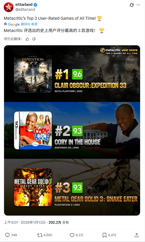 2026年1月13日,已经功成名就的《光与影:33号远征队》,迎来了一场前所未有的Metacritic玩家评分榜守擂之战。