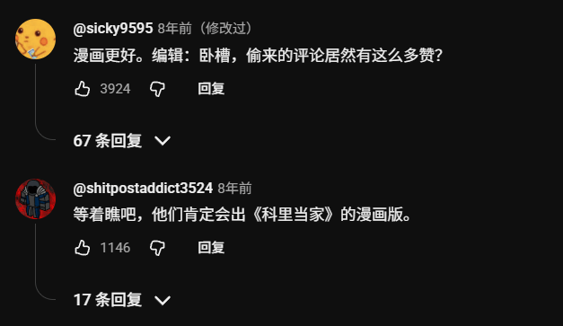 而为了让这个二创设定更加真实,在这个梗诞生后,还有很多人专门跑到正经讨论动漫的评论区里,刷屏“《柯瑞当家》是史上最好的动画”“实际上,《柯瑞当家》的漫画版比动画版要更好”等常见于二次元论坛的话术。