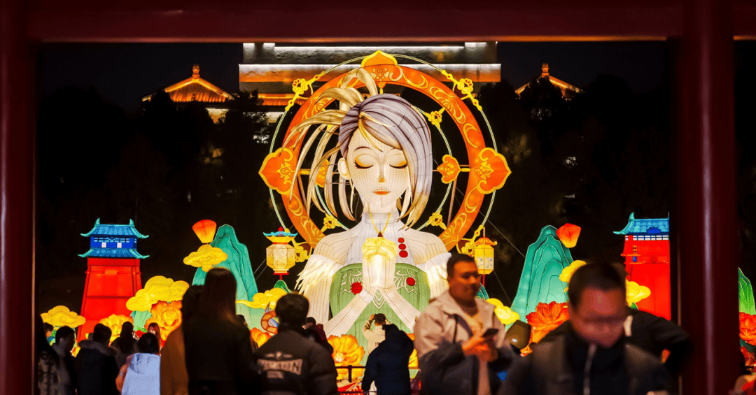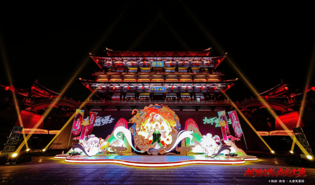 与此同时,官方在千年古都西安举办了一场线上线下场景相结合的联动活动。不仅在大唐芙蓉园内,以无人机阵列化作“勇士上号,地下城见”的巨型文案,最终点亮长达35米长的巨型赛丽亚祝福花灯,为所有玩家展现了一场盛大的亮灯仪式。更是将游戏中各种耳熟能详的元素,融合传统文化和长安的厚重历史,直接搬到了线下,带来了一场乐趣横生的文化盛宴。