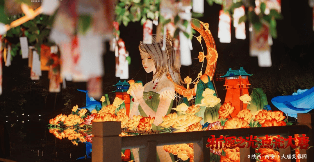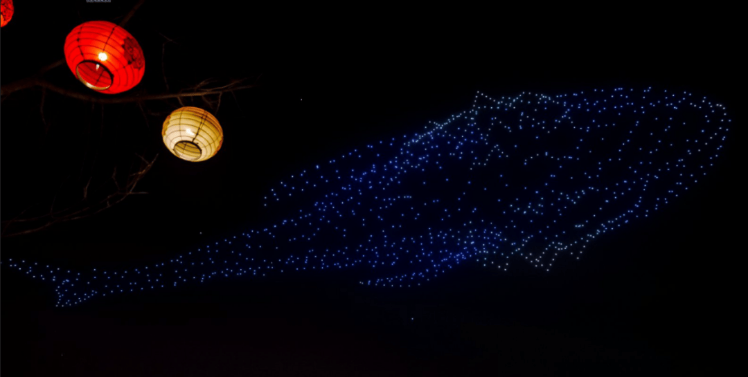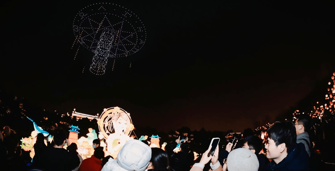 大约8点左右,无人机阵列从大唐芙蓉园一侧缓缓起飞,在空中摆出了天帷巨兽、赛丽亚、DNF传送门等诸多标志性元素,最终点亮下方35米长的巨型赛丽亚祝福花灯。