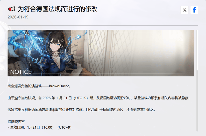最终,这个疑问在1月19日得到了解答,《棕色尘埃2》发布英文公告,表明为遵守当地法规,自 2026 年 1 月 21 日(UTC+9)起,从德国地区访问游戏时,某些游戏内服装和相关内容将被隐藏。