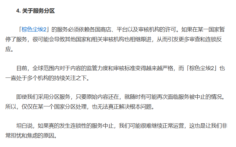 前两天,涩涩韩游《棕色尘埃2》宣布和谐后又紧急滑跪,撤回了和谐决定,当时官方公告中说到,此举是为了防止游戏在某一地区遭受下架后造成连锁反应,导致游戏难以正常运营。
