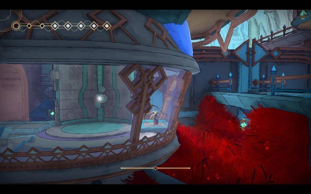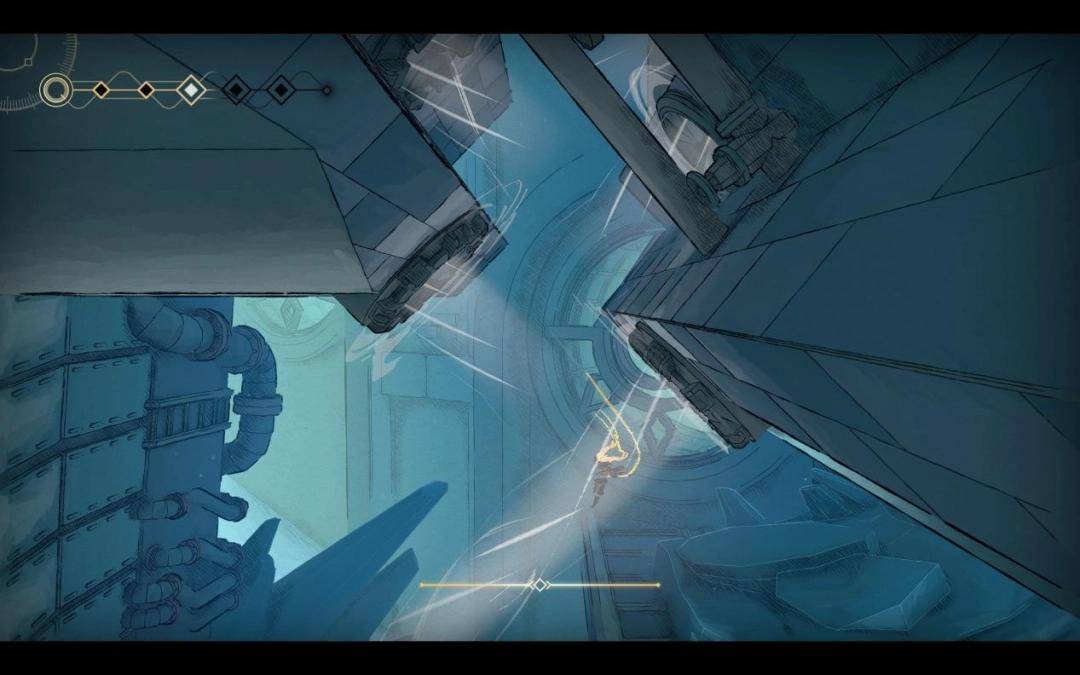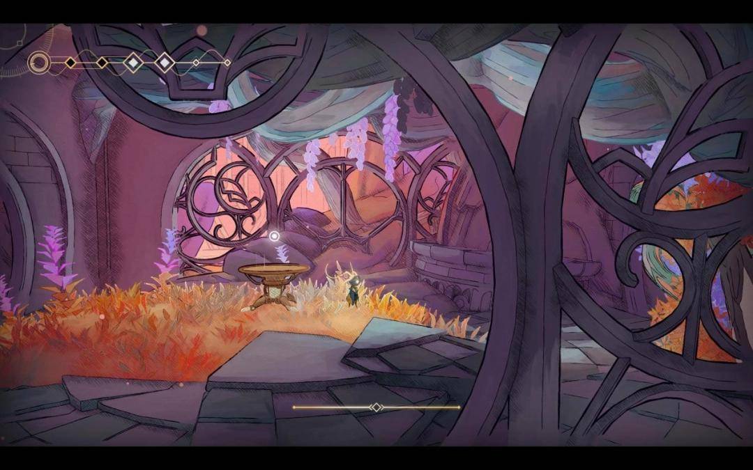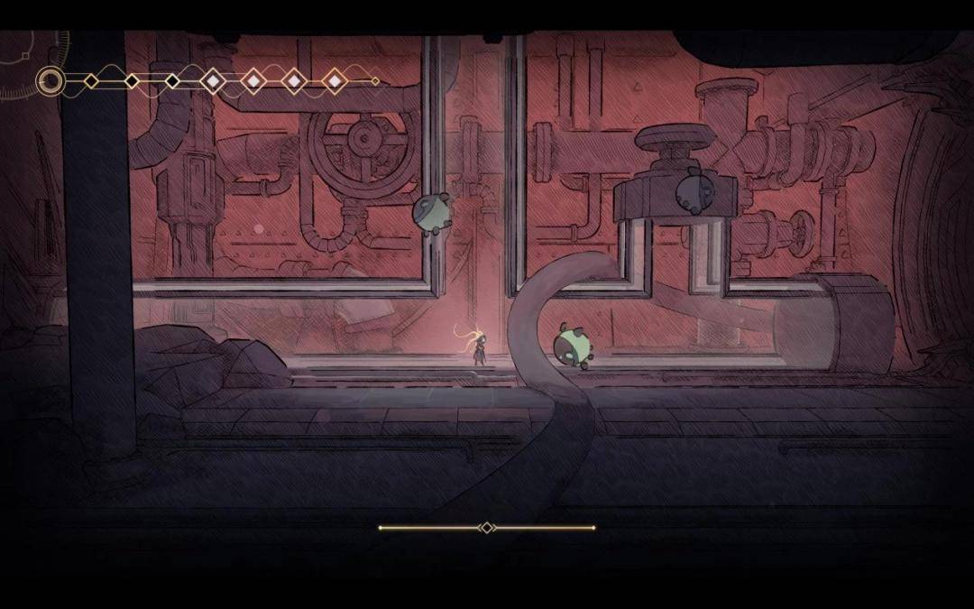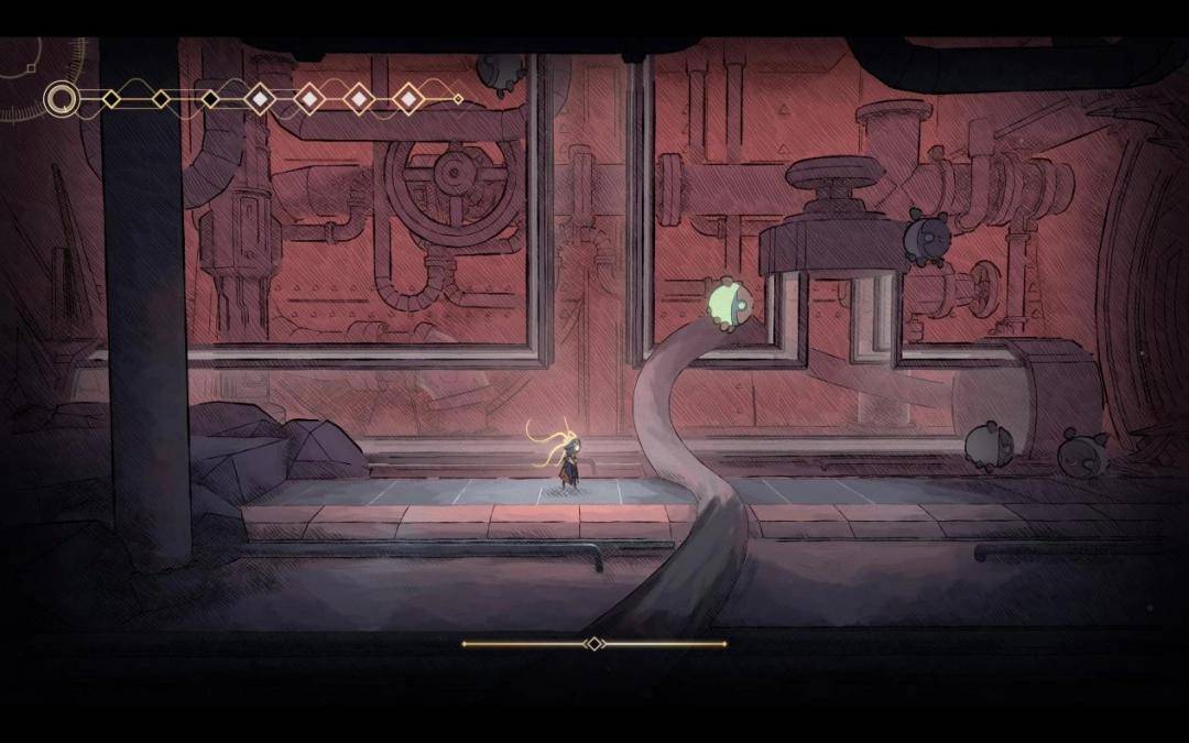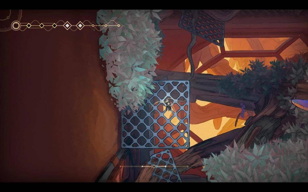 比如Douze Dixièmes为了表达美术概念使用了非常多前景的遮挡,这在许多同类游戏中是比较减分的点,因为这会影响玩家阅读地图。但在本作中,许多前景遮挡在装饰和氛围塑造外,也成了对玩家的一种“提示”,一些隐藏区域的衔接点会被藏匿在这些视觉死角处,这时能够改变观察角度的右摇杆,就获得了额外的探索功能。