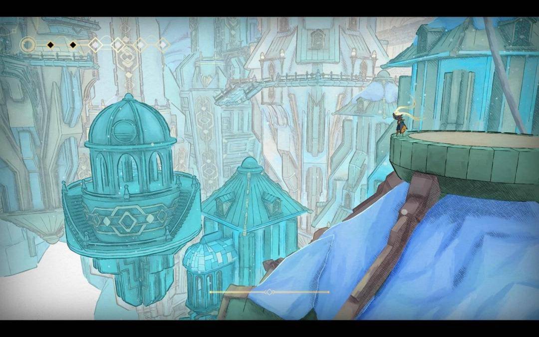 在《秘奥:秘宇奥忆》中,冷色调的水彩风格配合3D渲染所打造的景观,仍是他们在视觉上格外强调的地方。本作的美术表现也的确值得他们强调,原本横版的场景,在3D渲染过后有了很强的纵深感,前中后景的区分让每一个场景都相当立体。