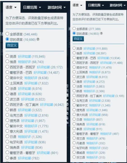观察类型游戏在商店页面的中文评论占比,我们可以发现一些规律: