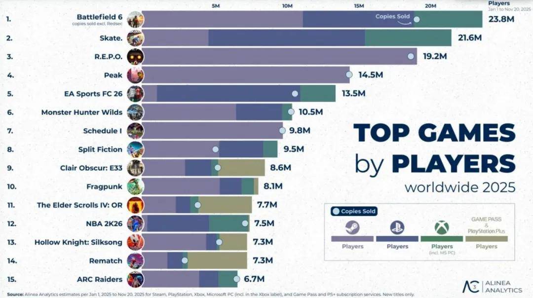 Steam 2025年度统计告诉我们,平台人数全年保持稳步上升,一年里从3900万来到了4200万,不少机构和统计都认为,大型在线对战游戏对此功不可没,像是《漫威:争锋》、《CS2》Major、《三角洲行动》国际服、《战地6》、《ARC Raiders》一系列游戏在各季度轮番发力,很好地承接了PVP玩家的口味。