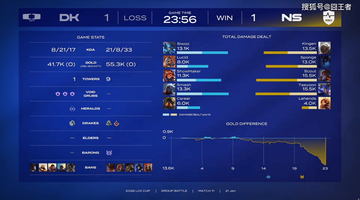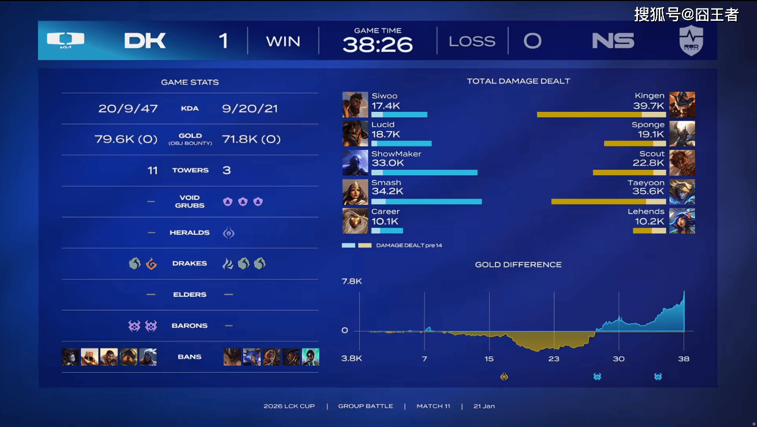 结果第一局比赛,两队各打了半场好局,DK笑到最后。前期,NS对线期一度打出4000多的经济领先,但比赛第27分钟左右,DK抓住机会小龙团击杀Sponge后开打大龙;比赛第27分钟左右,DK大龙逼团先后打出0换3,随后击杀Lehends妮蔻拿下大龙;比赛第29分钟左右,DK带大龙推进一波打出1换2;比赛第31分钟左右,DK抱团推下爆发激战,Lucid皇子残局坐巴德隧道过墙被秒,两边打成3换3;比赛第35分钟左右,DK打出0换3再次拿下大龙;最终比赛第38分26秒,DK一波结束比赛。
