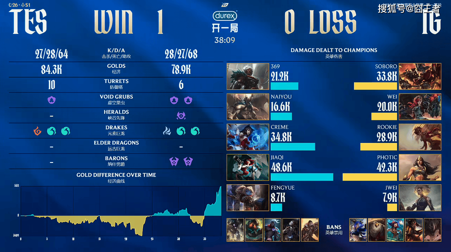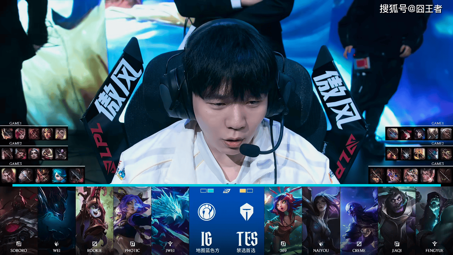 第三局比赛,TES蓝色方,禁用:石头人,赵信,琪亚娜,阿萝拉,蛇女,选用:369掘墓,Naiyou蒙多,Creme瑞兹,JiaQi卡莎,Fengyue妮蔻;IG红色方,禁用:杰斯,发条,皇子,格温,剑魔,选用:Soboro塞恩,Wei梦魇,Rookie冰鸟,Photic芸阿娜,Jwei璐璐