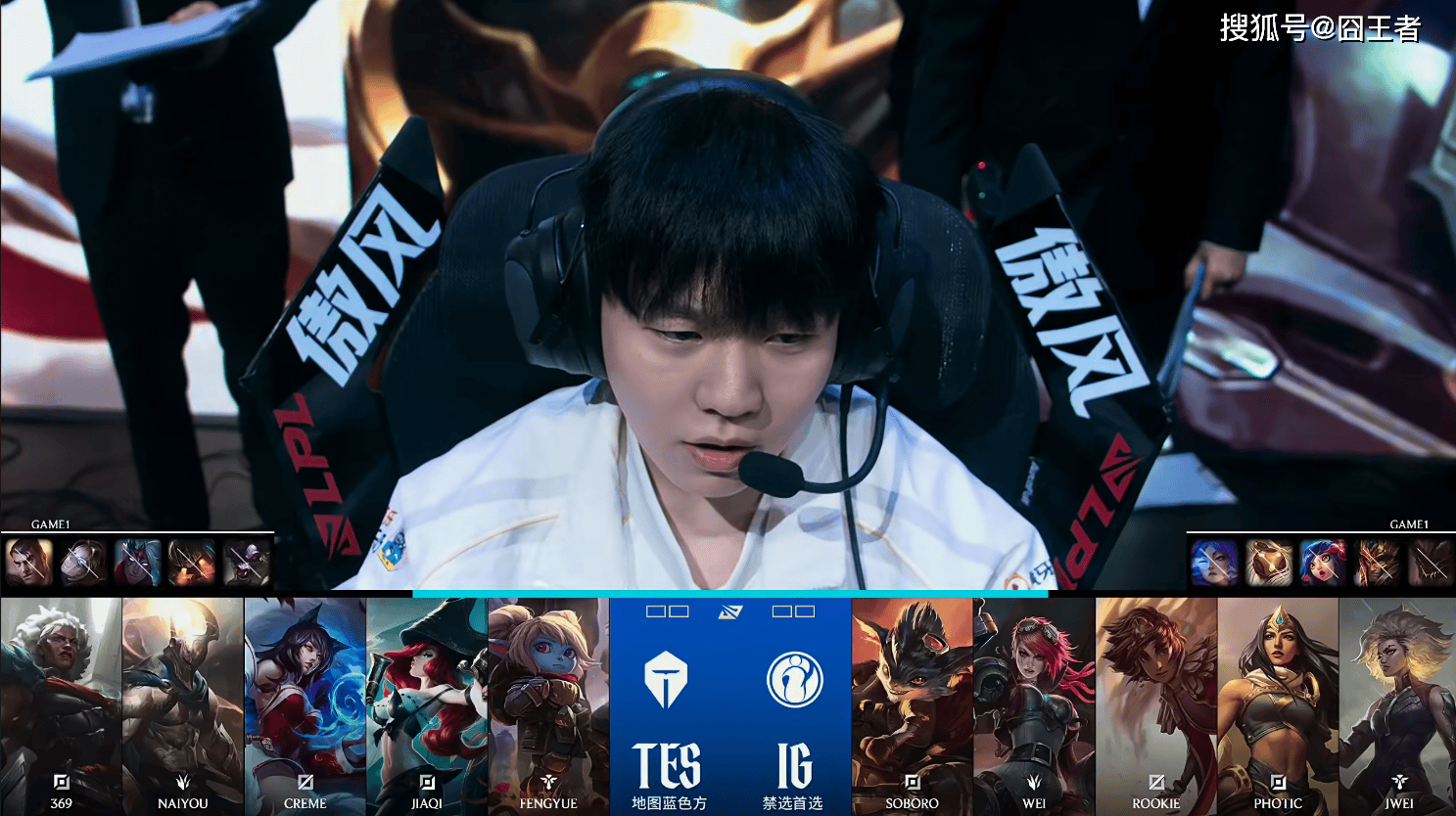 第一局比赛,TES蓝色方,禁用:杰斯,发条,韦鲁斯,泰坦,牛头,选用:369狼母,Naiyou潘森,Creme阿狸,Jwei女枪,Fengyue波比;IG红色方,禁用:石头人,皇子,妮蔻,巴德,芸阿娜,选用:Soboro兰博,Wei蔚,Rookie岩雀,Photic希维尔,Jwei芮尔