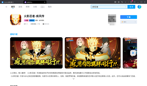 第四步:进入《火影忍者》游戏详情页,点击右侧按钮,即可完成游戏下载和安装。