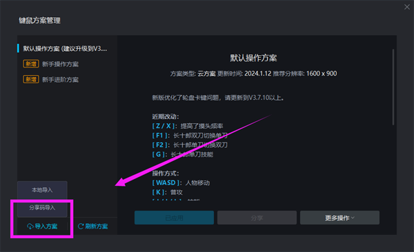 第七步:点击左下角的【导入方案】选择【分享码导入】输入分享码:mumu0914928923;即可导入火影忍者高适配键鼠按键操作方案使用。