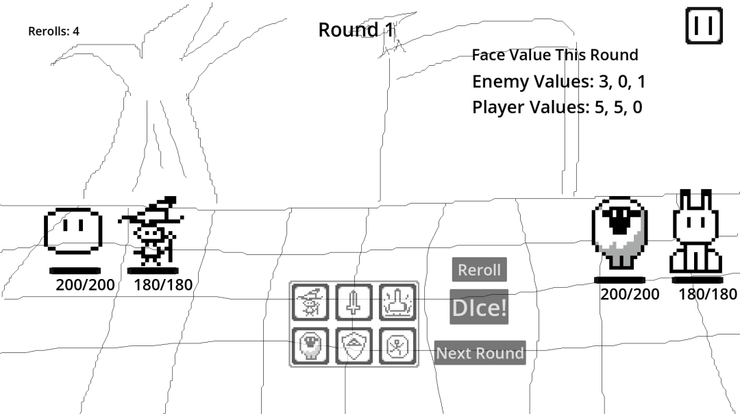 Dicer 是一款 2D、回合制、策略、roguelike 游戏——2D 和回合制是因为我不想挑战自己,策略和肉鸽是因为我爱玩。策略肉鸽里卡牌很多,但是因为卡牌太多了,所以我准备做骰子肉鸽。但是骰子肉鸽也很多。经过我的分析,骰子肉鸽不外乎两种:以“投出特定点数”为核心的数字游戏,和把骰子作为随机数生成器的类卡牌游戏。前者比如 Die in the Dungeon 和骰子地下城,后者比如 Dicefolk 和 Astrea。我不想做这两类游戏,前者代入感不强,后者和卡牌游戏太类似了,让骰子这个载体没有什么意义,而且骰子投不出想要的点数,比鬼抽更让人难受。怎么办?自己做呗。