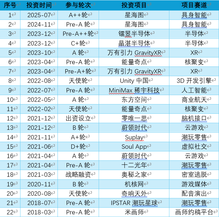 比如,具身智能公司星海图,2024年到2025年米哈游连续2次注资;2021年6月成立的国内第一家可控核聚变公司能量奇点,天使轮和Pre-A轮融资背后都有米哈游的影子;2022年,米哈游还参投了民营火箭公司东方空间的A轮融资;2021年,米哈游与上海交大的吕宝粮教授联合创立零唯一思,主攻脑机接口和情感智能技术。