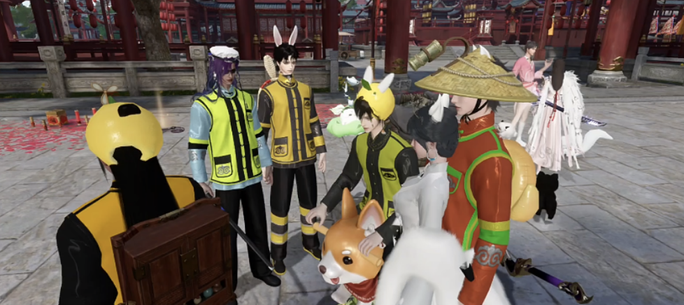 同样是“畲乡赶月”这套时装,只不过玩家们将原色染成了美团外卖经典的黄色,再佩戴个兔子耳朵,妥妥的美团小哥了~Cos饿了么小哥也不是不可以。