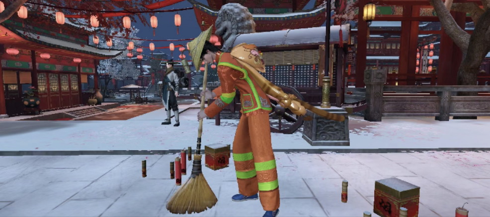 例如,玩家化身为大宋环卫工,身穿黄绿配色的衣服,头戴草帽,手持扫帚,勤奋地清扫地面上的垃圾。