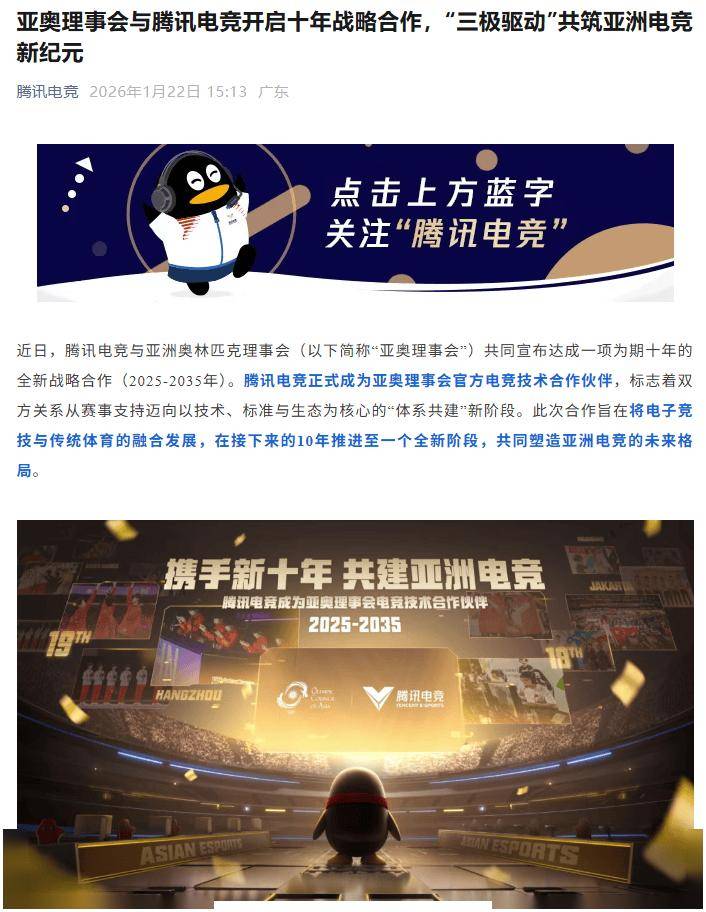 IT之家 1 月 22 日消息,近日,腾讯电竞与亚洲奥林匹克理事会(以下简称“亚奥理事会”)共同宣布达成一项为期十年的全新战略合作(2025-2035 年),腾讯电竞正式成为亚奥理事会官方电竞技术合作伙伴。