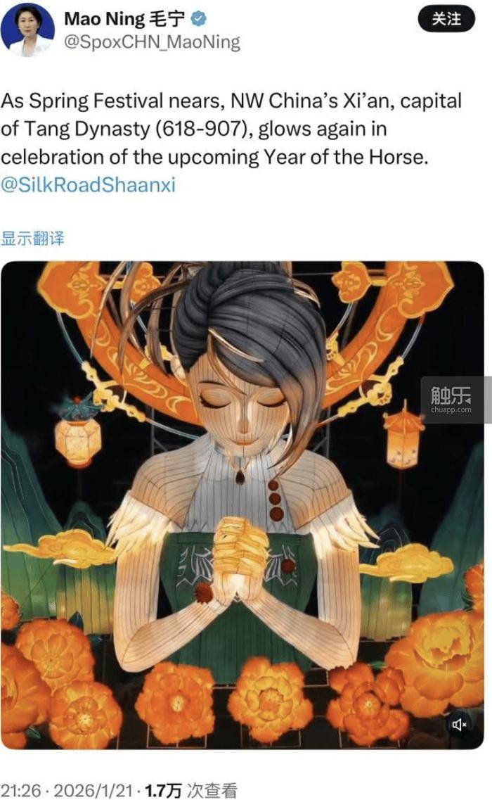 这些很有文化性的布置让现场的活动多了些其他内涵和价值。昨天晚上(1月21日),外交部发言人毛宁还在推上发了有关赛丽亚花灯的内容,从这个角度来说,“游戏”成为了文化传播的载体。