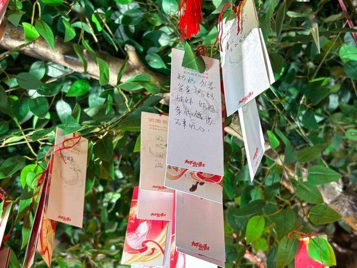 曲江池畔边也举办了一场送河灯仪式,来到线下的游客可以亲手在这里放送河灯、许下愿望,后来我了解到,线上玩家也可以留下自己的祝福,也有机会被定制印制成实体许愿签,系在河灯上。大部分签文上都是一些平淡、温馨和生活有关的许愿,反而有一种珍贵。