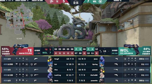 下半场第15回合狼队的长枪分没能打赢,Kai站住中路拉扯,让狼队无法回防。TE双决斗双先锋阵容,进攻性直接拉满,TE下半场连拿四分,但在第17回合TE第一波进攻强行进点,没有用出大招,被狼队赢下拿到下半场首分。第19回合TE在B点端掉狼队的回防,打出完美团灭。狼队下半场两个暂停的调整都没能拿分,最终被TE在20回合控中夹B的拉扯下赢下,TE 13-7赢下幽邃地窟。