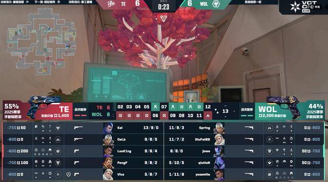 上半场手枪局阶段,FengF回防打赢1v1拿下首分,但狼队第2回合直接变奏,蜂刺大队直接撕开TE在A点的防守,狼队打出一波翻盘,直接让TE在第3回合“全员跳崖”。第5回合小肥在B包点一人守包,架住TE的回防打出ACE,直接带队打出四连胜。TE陷入经济窘境,他们在起到长枪后开始追分,在回防阶段TE打赢,Kai与FengF的发挥直接带队将比分追平,上半场两队6-6。