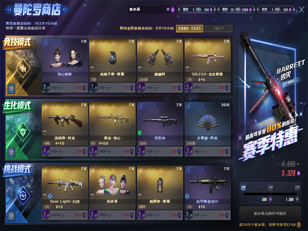 其次,本期曼陀罗商店的压轴奖励就是毁灭,只需消耗一定数量的紫水晶后,最低两折即可购买原版毁灭,性价比是非常高的,而且用来提升折扣力度所消耗的紫水晶可以兑换期限的命运级角色、雷霆系列武器等稀有道具,可以说是一举多得。