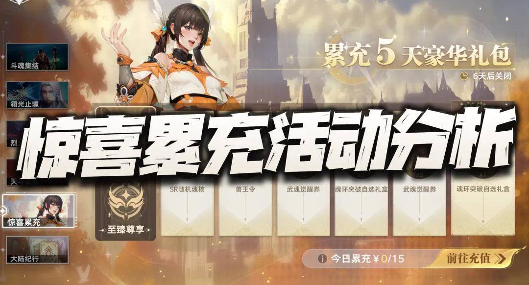 首先简单说两句这个每日15元的常规档位,此档位的5日连充活动也上过很多次了,而这波的核心奖励还是3日的5张券和5日的5张券,一共加起来就是10张券,外加2个魂环突破自选礼,这样的总计成本需要75元,说起来单论这个肯定是不值的,但如果大家过去有买过每日这个15元礼包的话,这些奖励加在一起倒也还说得过去,大家可以参考参考。