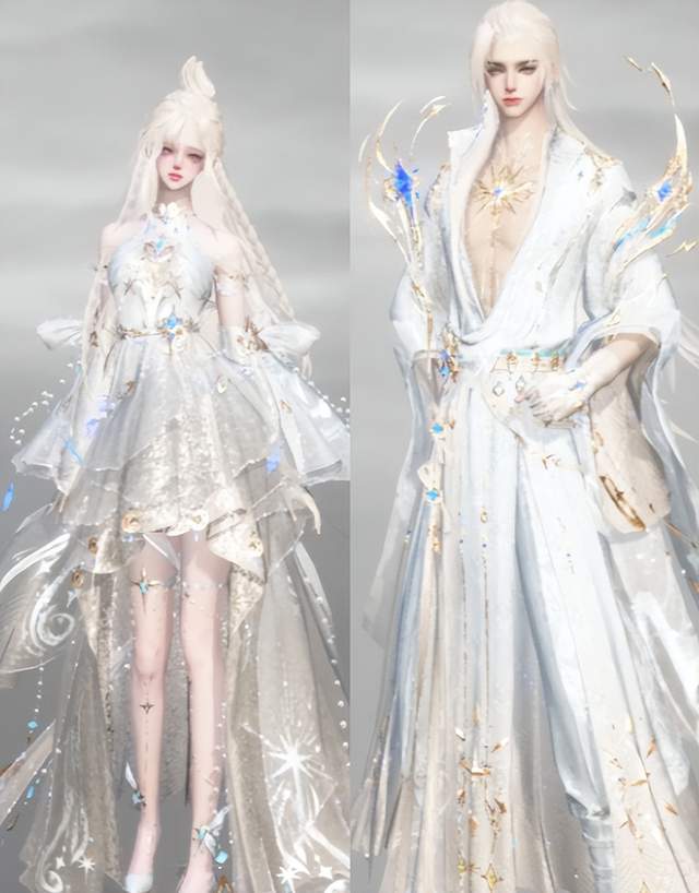 白色的【云汉逢夕】给人一种婚服的感觉,洁白的色调搭配上高贵的白金配色,使整个造型显得格外贵气十足。穿上这套白色时装,下一秒大家就可以直接去举办华丽的婚礼了,超闪超吸睛!